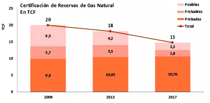 De todos modos, según un primer análisis de Jubileo, las reservas totales de gas natural (14 TCF) cayeron en un 19%, comparadas con los datos que se tenía hace cuatro años.