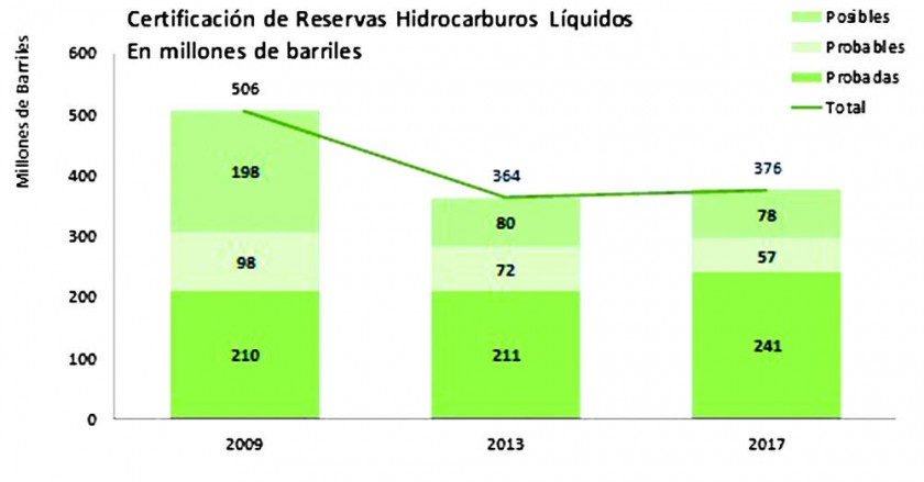 Y respecto a las “reservas probables certificadas de hidrocarburos líquidos, estas alcanzarían a 57 millones de barriles de petróleo, equivalente a un 21% menos que los 72 millones de barriles certificados hace cuatro años”.
