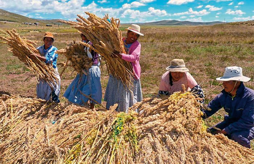 Un grupo de agricultores de la región de Salinas de Garci Mendoza, Oruro, cosecha quinua en proximidades del volcán Tunu La famosa Exposición Internacional de Importaciones de China (CIIE) contó este año con la participación de productores bolivianos de quinua real, un producto típico de la zona altiplánica que busca mercados internacionales