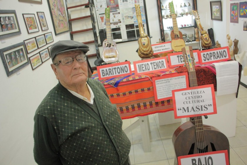 Allí se puede observar cinco tipos del instrumento construidos sobre la base de una de las técnicas de su maestro don Mauro, con quien se destacó en este delicado trabajo desde muy joven.