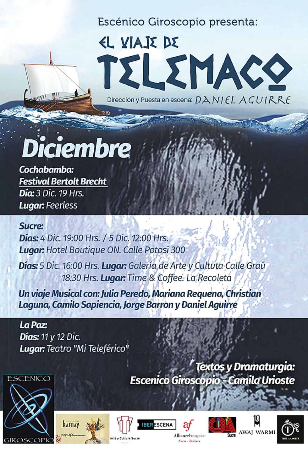 “El viaje de Telémaco”, obra del sucrense Daniel Aguirre que se anuncia como un viaje musical a cargo de Escénico Giroscopio Teatro, se presentará el 4 y 5 de diciembre en tres espacios culturales de la capital.