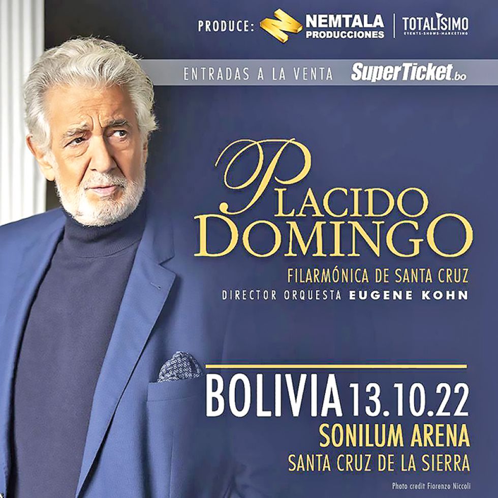 De la mano de Nemtala Producciones, para el 13 de octubre se anuncia el concierto del tenor español Plácido Domingo quien, además de cantar con músicos de la Filarmónica de Santa Cruz, estrenará el teatro Sonilum Arena.