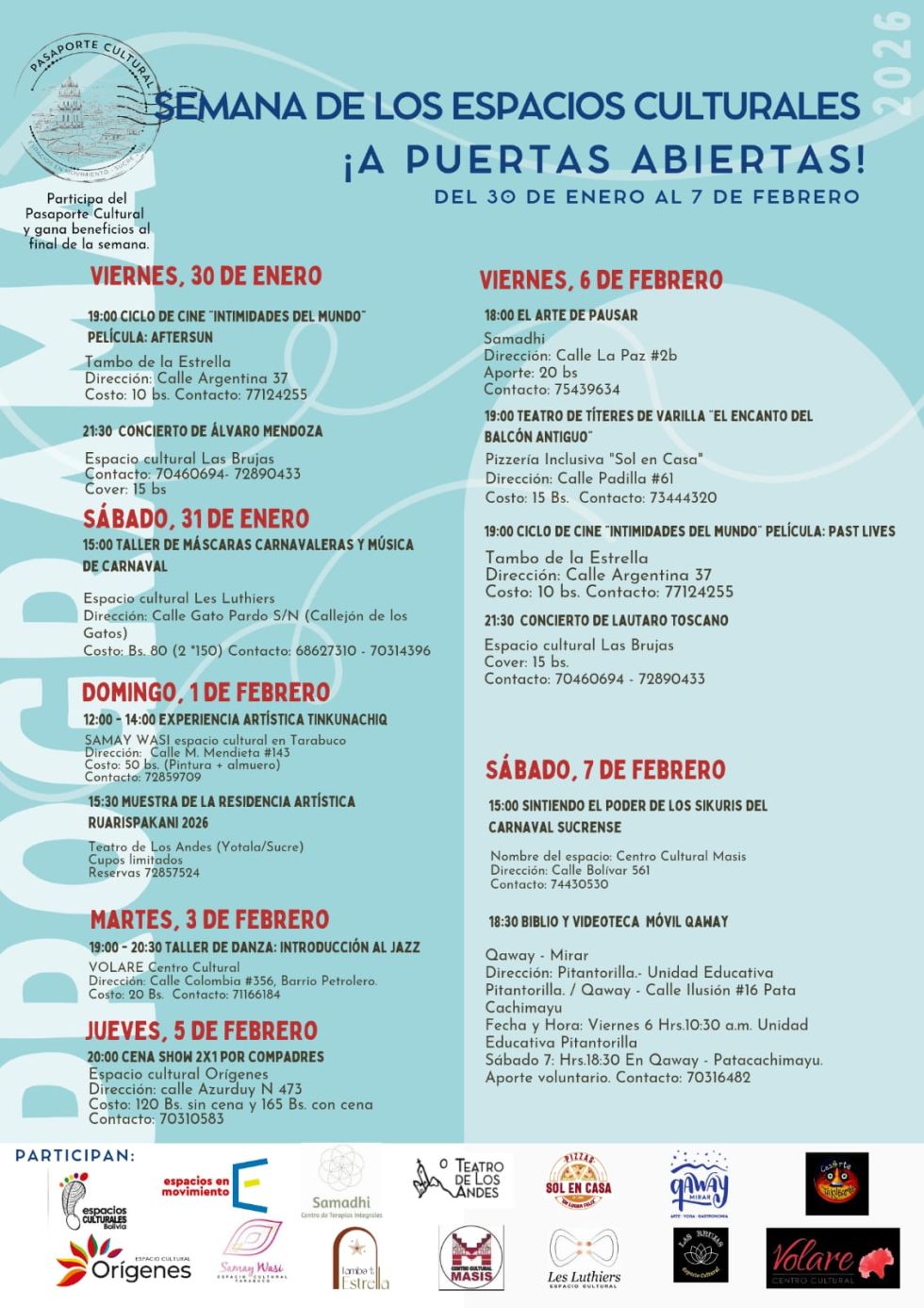 Hasta este sábado 7 de febrero está en marcha en Sucre una atractiva agenda en la Semana de los Espacios Culturales “A puertas abiertas”, organizada por los espacios culturales autogestionados.
