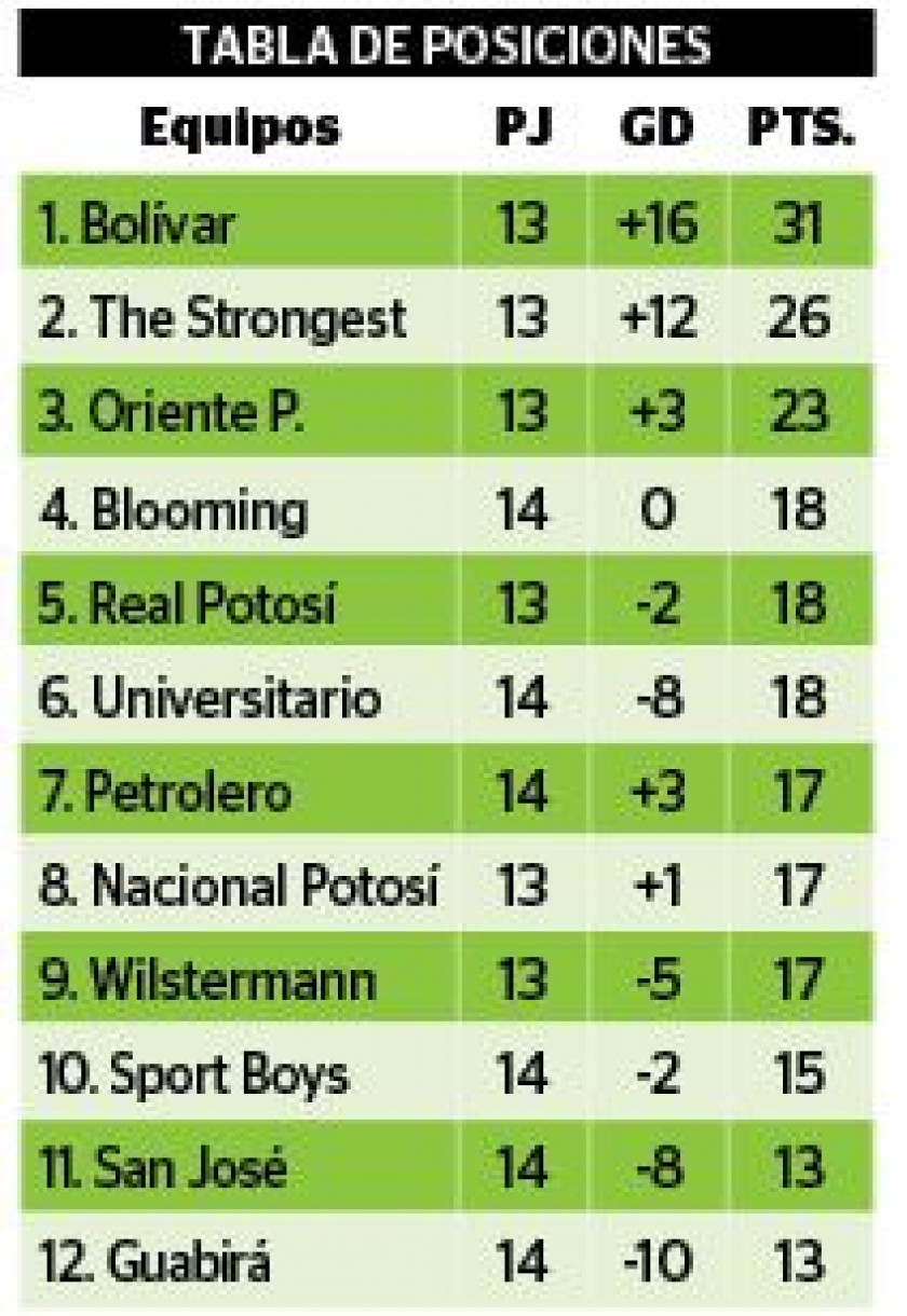 Con el triunfo de ayer, el “docto” suma 18 puntos e igualó la línea de Blooming y Real Potosí, aunque el cuadro lila podría subir en la tabla si hoy derrota a Nacional Potosí en el clásico de la Villa Imperial.