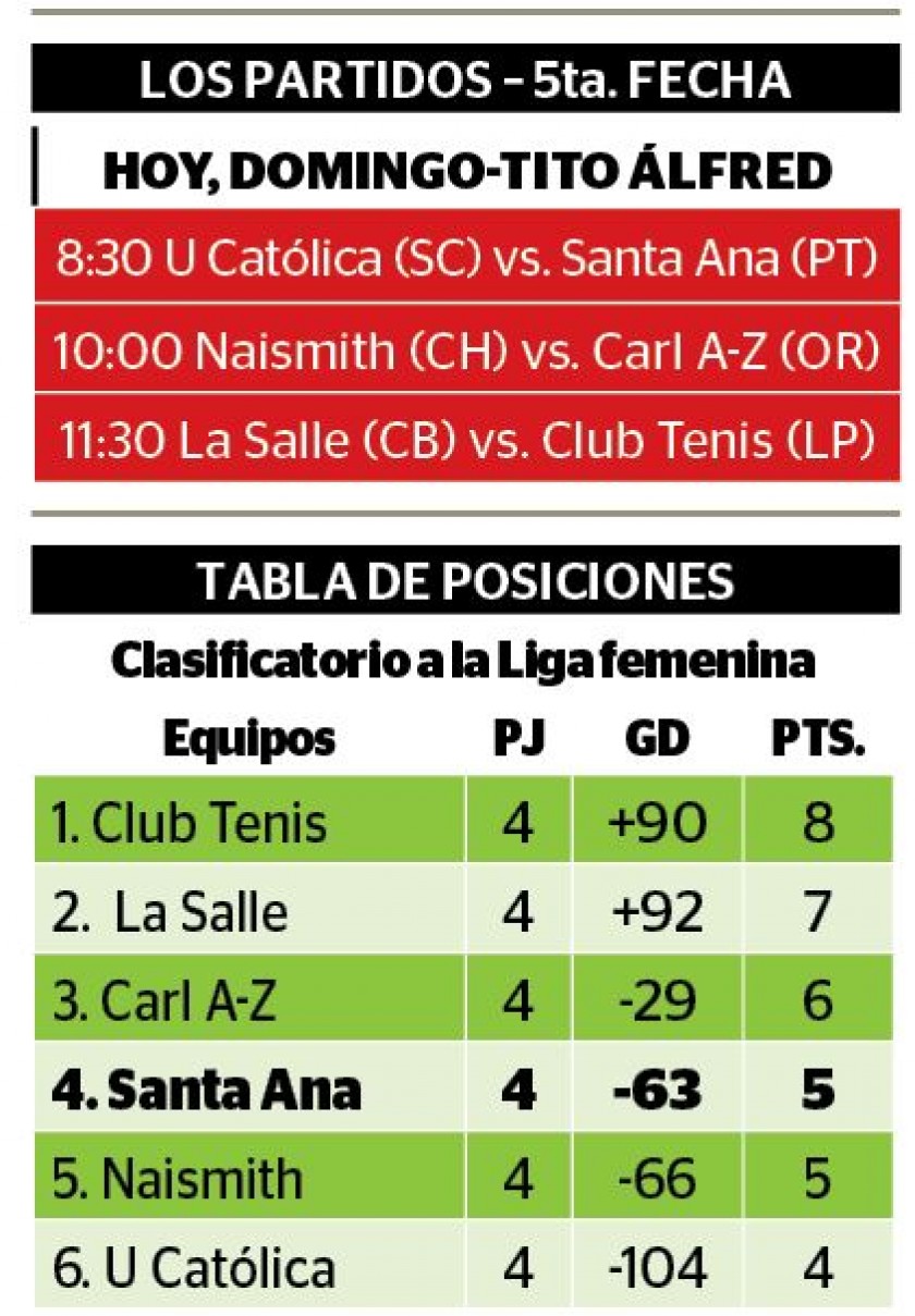 El segundo pasaje se definirá hoy. La Salle, con su victoria ayer sobre la Universidad Católica de Santa Cruz (74-42), y Carl A-Z de Oruro, tras vencer a Santa Ana (73-52), son los candidatos.