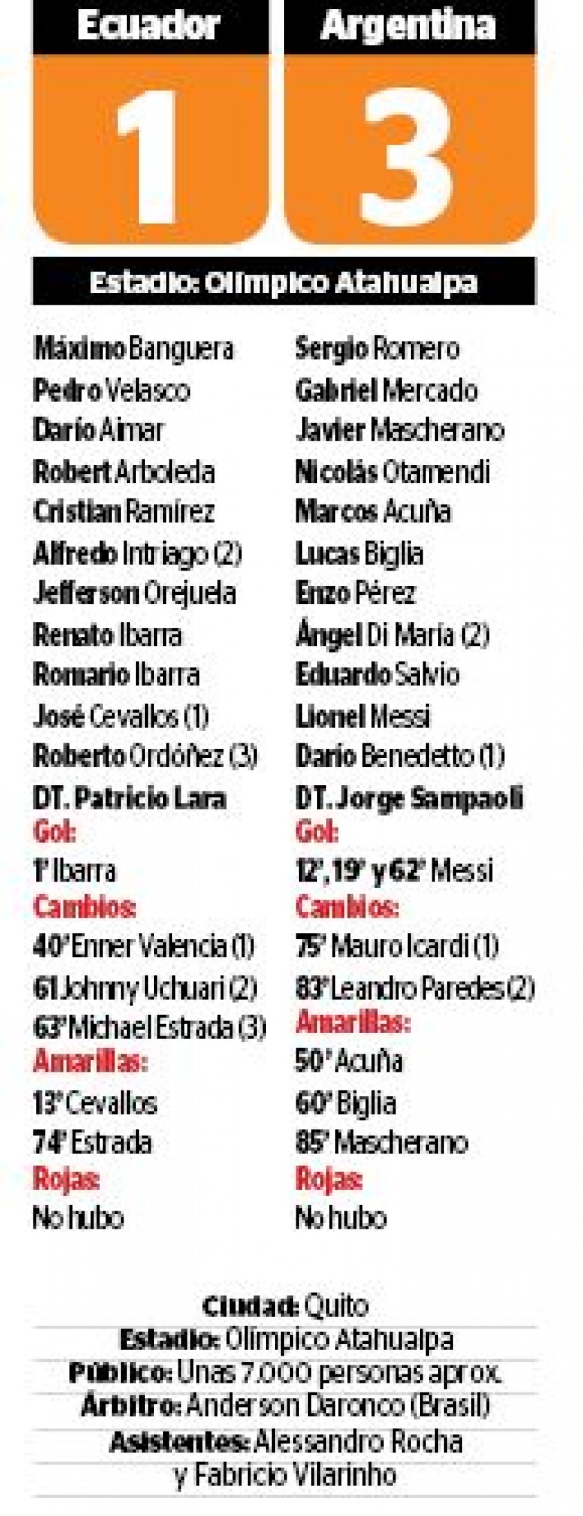 Benedetto, Di María y Messi tejieron otra rápida jugada, que no pudo contrarrestar la defensa ecuatoriana, y Leo, con un toque sobre el portero, infló otra vez la red contraria, a los 19 minutos (1-2).