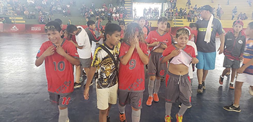 Los estudiantes del colegio Alemán abandonan el campo de juego, luego de batallar en la semifinal del fútbol de salón de los Juegos. Foto: Gentileza Las aspiraciones de Chuquisaca para estar en las finales de los deportes de conjunto fueron sepultadas en la penúltima jornada de competencia de la fase nacional de los Juegos Estudiantiles Plurinacionales nivel primario.