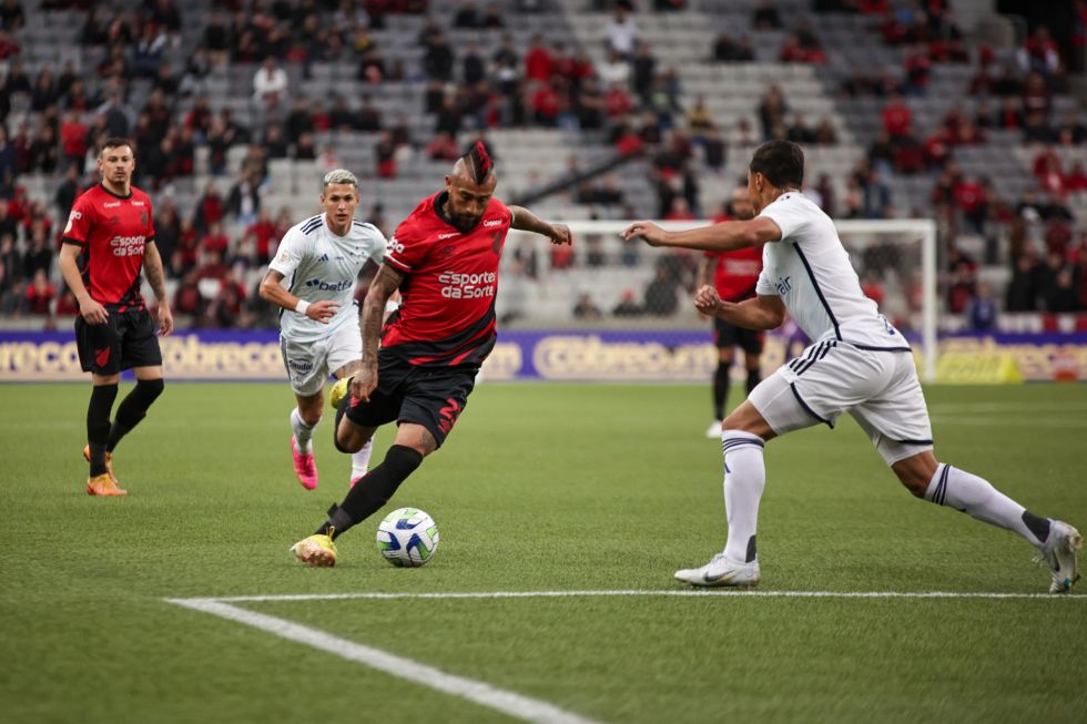 Arturo Vidal del Athletico Paranaense domina el balón ante la marca de un rival de Cruzeiro. Foto: Twitter Brasileirao Antes de subirse al avión rumbo a La Paz, Athletico Paranaense empató 3-3 en un partidazo ante Cruzeiro por la decimoséptima fecha del Brasileirao. Este martes (20:00) se medirá ante Bolívar, en el estadio Hernando Siles, por la ida de los octavos de final de la Copa Libertadores.