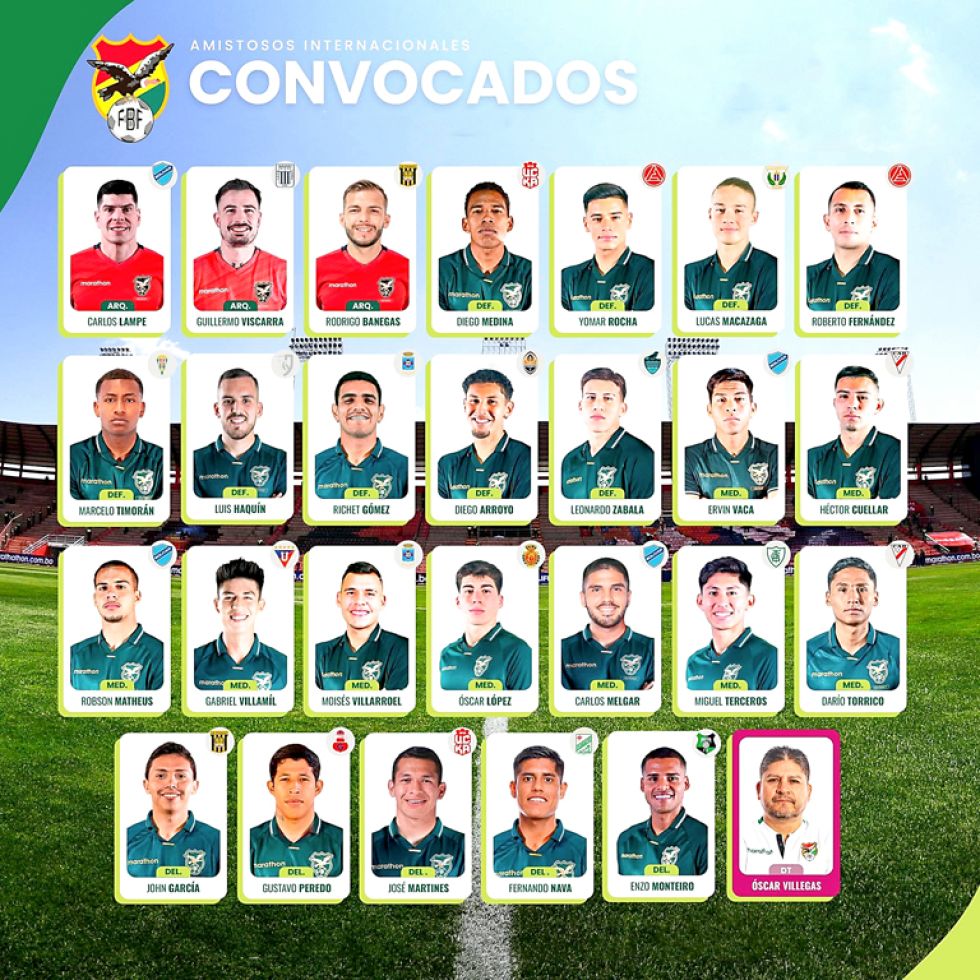 El gráfico con la lista de convocados que publicó la Federación Boliviana de Fútbol en sus redes sociales. Con novedades. El defensor Richet Gómez, el mediocampista Jhon García y el delantero Fernando Nava son las caras nuevas en la convocatoria de Óscar Villegas para los partidos amistosos que la Selección boliviana jugará este mes de noviembre en Asia. La lista de 26 jugadores fue publicada anoche por la Federación Boliviana de Fútbol.