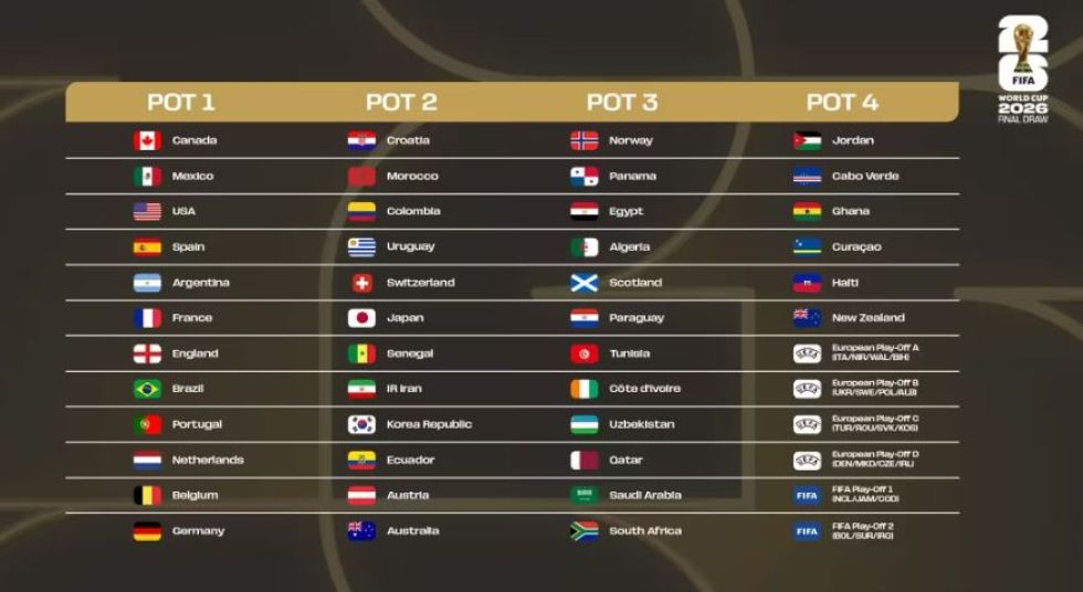 Bombo 4: Jordania, Cabo Verde, Ghana, Curasao, Haití, Nueva Zelanda, clasificados A, B, C y D de las eliminatorias europeas, clasificados 1 y 2 del torneo clasificatorio de la FIFA