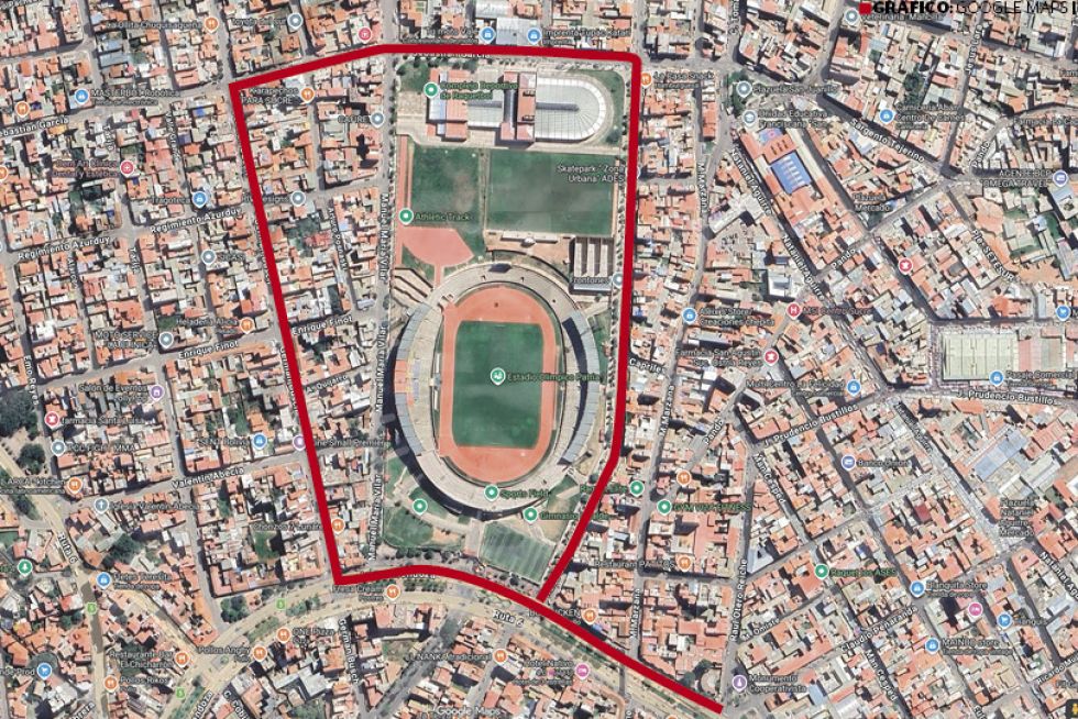 El corte vehicular de la parte posterior del estadio comenzará en la calle Sebastián García, esquinas Marzana y Germán Busch; además, se paralizará la circulación de las calles comprendidas en esa zona (Arturo Posnaski, Regimiento Azurduy, Enrique Finot, Quijarro y Valentín Abecia).