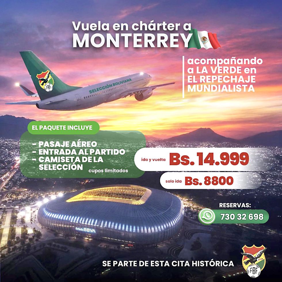 “Si quieres formar parte de esta experiencia inigualable de acompañar a la Selección Boliviana de Fútbol en Monterrey-México te proponemos un paquete con viaje en vuelo chárter, entrada a partido y la camiseta oficial de la Verde”, señala la oferta federativa.