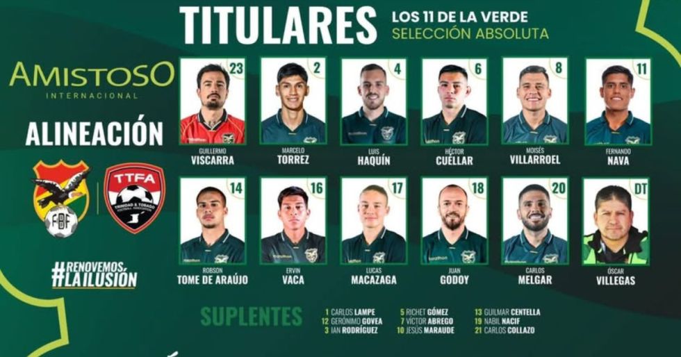 La Selección de fútbol de Bolivia quedó lista para disputar su último partido amistoso antes del repechaje rumbo al Mundial. El director técnico Óscar Villegas confirmó la alineación titular que enfrentará este domingo a la Selección de fútbol de Trinidad y Tobago en la ciudad de Santa Cruz de la Sierra.