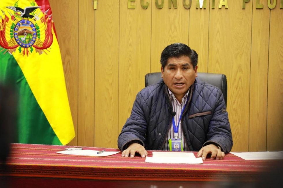 El ministro de Desarrollo Productivo, Néstor Huanca, esta sábado en una conferencia de prensa. Foto: Prensa Gobierno La banda de precios de la harina de soya generó división entre los productores. Los pequeños agricultores no están de acuerdo con el paro que convocó Anapo. Mientras, el Gobierno propuso que solo se controlará el 20 por ciento de la producción que llega a avicultores y ganaderos.
