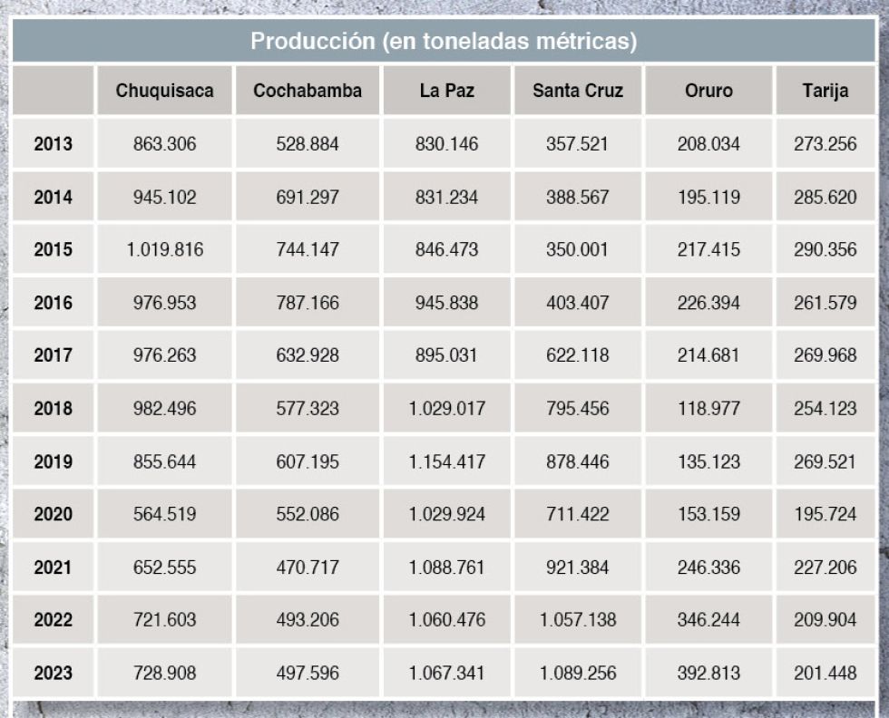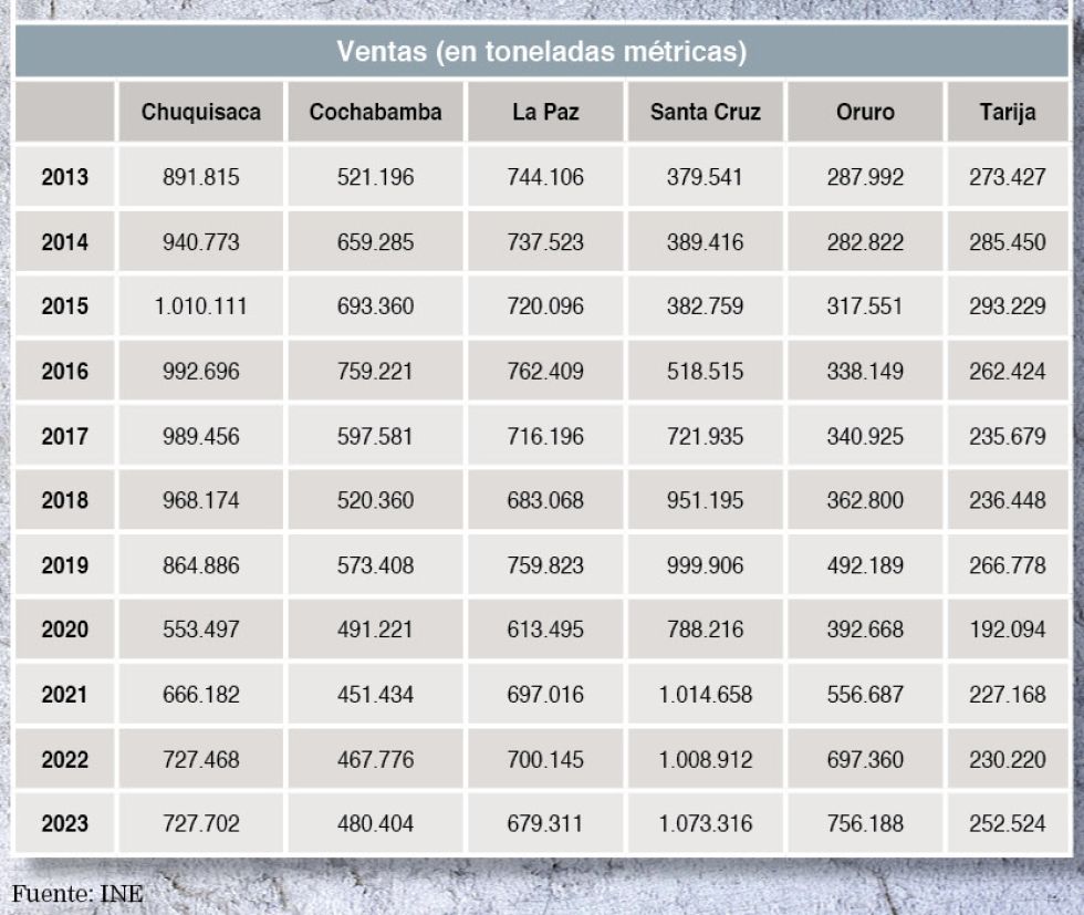 En la página web del INE, se puede acceder a cuadros estadísticos de la producción, ventas y consumo por departamento según año y mes (ver cuadro aparte). Es decir, las ventas que hace Fancesa en Santa Cruz u otros departamentos del país se las acredita a Sucre; por lo tanto, en la página web del INE es imposible obtener datos de participación de las empresas por mercado.