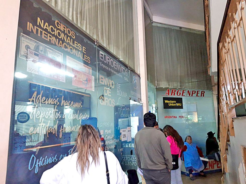 “Como hay escasez de dólares estamos pagando solo en bolivianos, el mismo sistema del exterior se lo convierte al tipo de cambio en bolivianos”, dijo a CORREO DEL SUR el encargado de una de las empresas de transferencias de dinero desde el exterior.