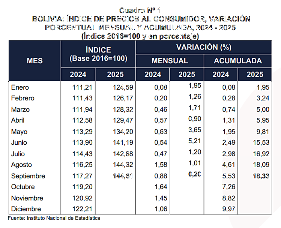 Pese a la desaceleración, el economista Fernando Romero advirtió que “la inflación acumulada de septiembre 2025, es la mas alta de los últimos 40 años, comparando con las inflaciones acumuladas de septiembre desde 1987 al 2024”, es decir, en 37 años. Además, hizo notar que se trata de la inflación más elevada desde que gobierna el socialismo en Bolivia.
