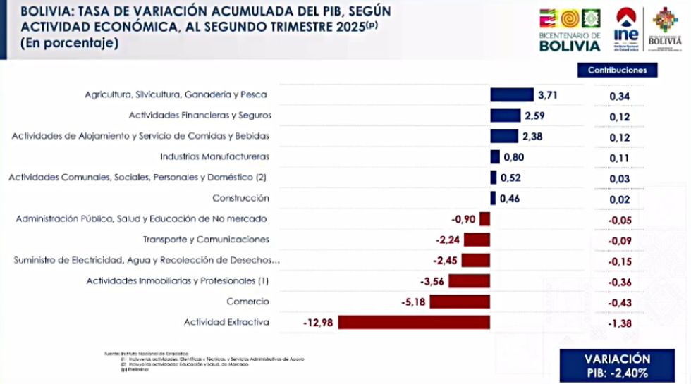 “Al primer semestre de 2025 Bolivia registró una tasa de crecimiento negativa de 2,40%”, informó este martes el director del Instituto Nacional de Estadística (INE), Humberto Arandia, durante la presentación del “cambio de año de referencias de cuentas nacionales”.