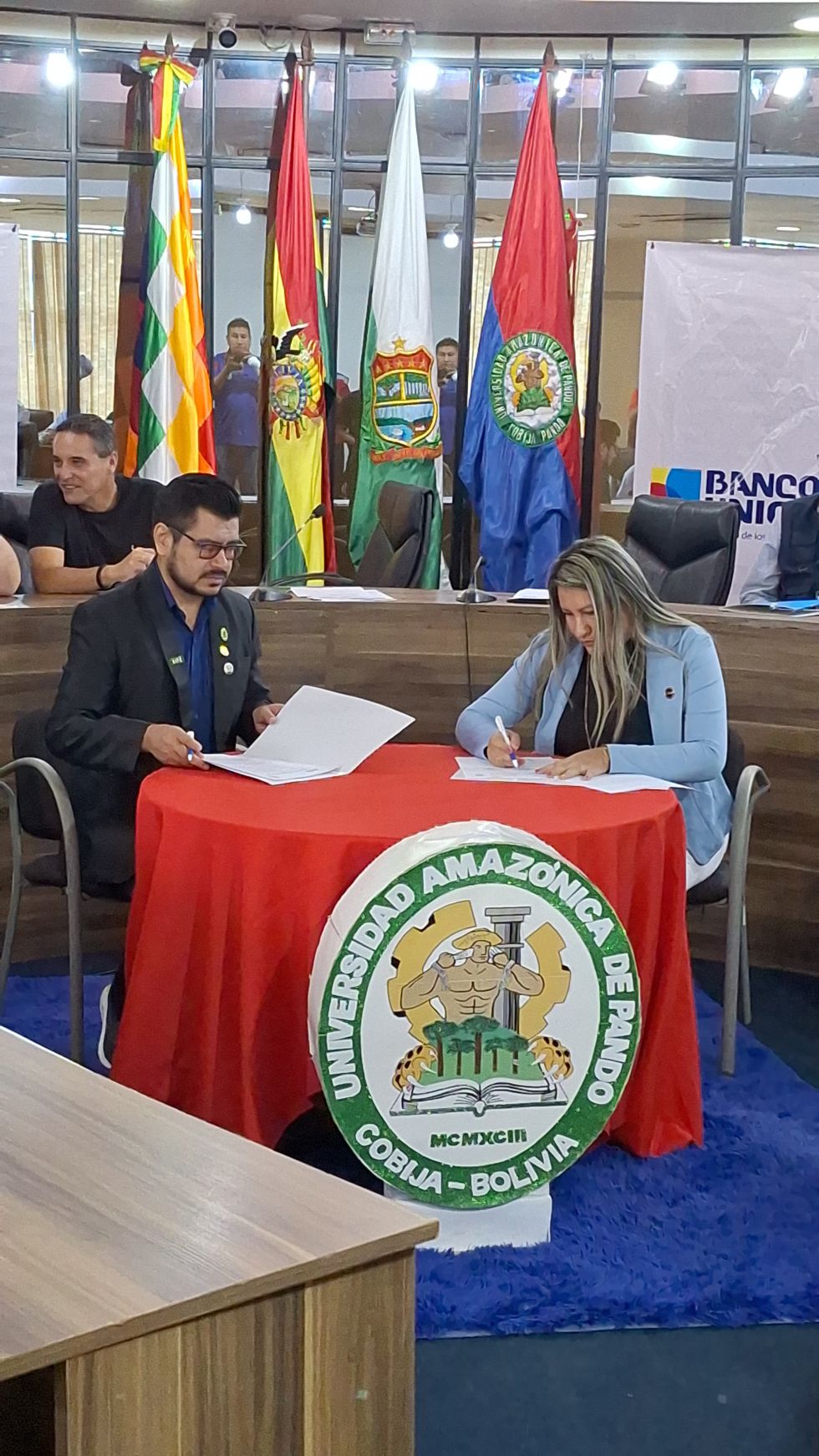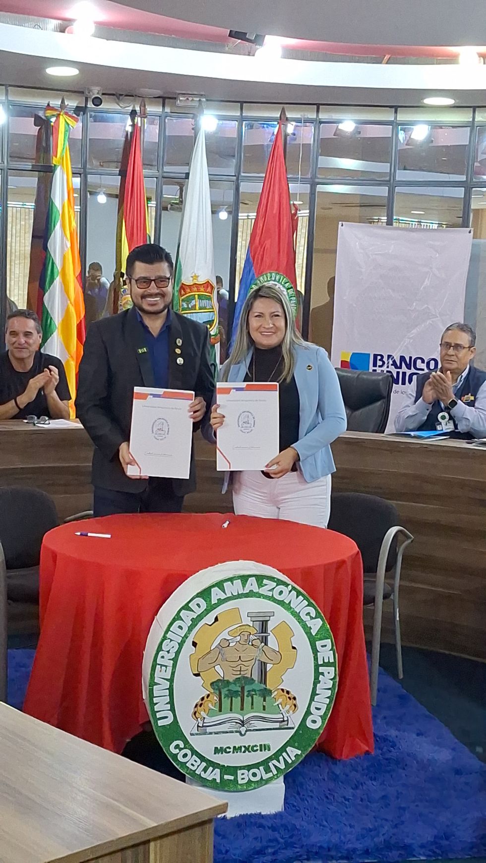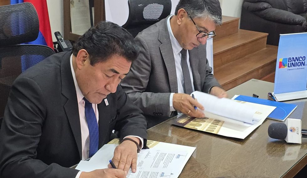 El primero de estos acuerdos fue suscrito el jueves 8 de octubre en la ciudad de Cobija, entre el rector de la Universidad Amazónica de Pando, Franz Navia Miranda, y la gerente de sucursal de Pando de Banco Unión S.A., Beatriz Litzi Navia Miranda.