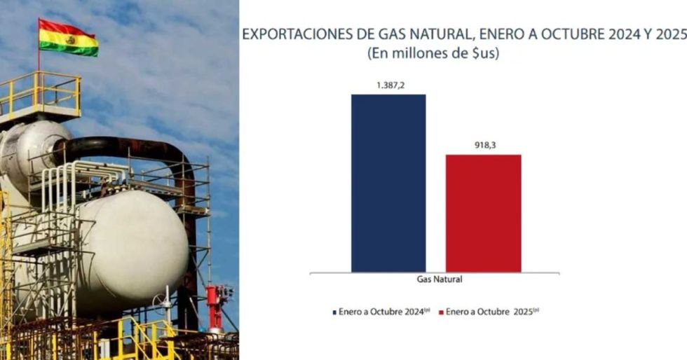 De acuerdo con los datos oficiales, Bolivia exportó 918,3 millones de dólares en gas natural entre enero y octubre de 2025. En el mismo periodo del año anterior, la cifra alcanzó 1.387,2 millones de dólares, lo que refleja una baja del 33,8% en los envíos, principalmente dirigidos al mercado brasileño.