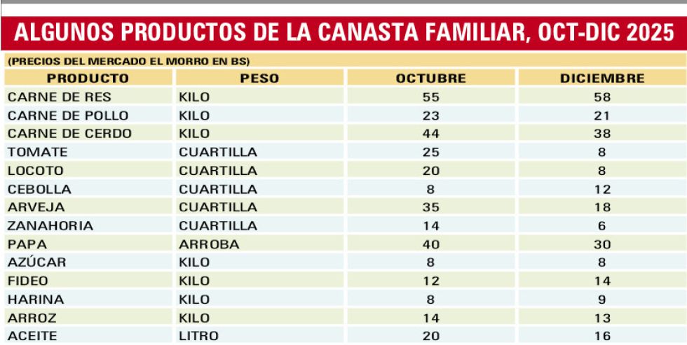Entre los principales productos de consumo diario con similar tendencia destacan la arveja que bajó a Bs 18 la cuartilla; el locoto, Bs 8; y la zanahoria, Bs 6. No ocurrió lo mismo con la cebolla, que de estar en Bs 8 ahora se comercializa en Bs 12.