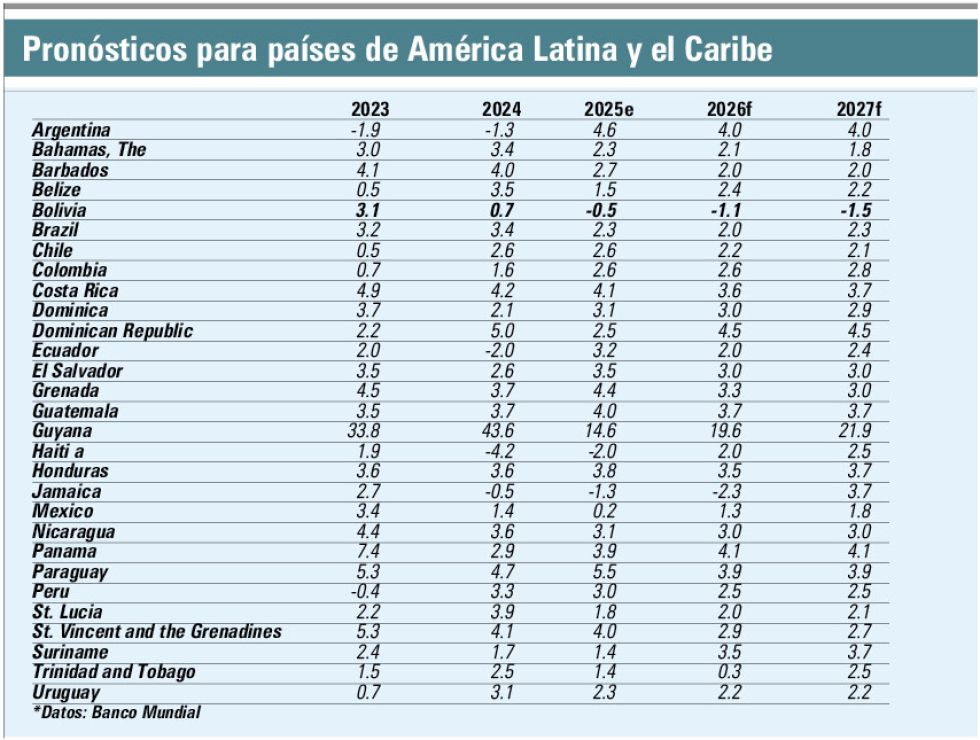 Para América Latina y el Caribe, el BM prevé que el crecimiento aumentará al 2,3% en 2026 y continuará subiendo hasta llegar al 2,6% en 2027, cifras que contrastan con las previsiones para Bolivia.