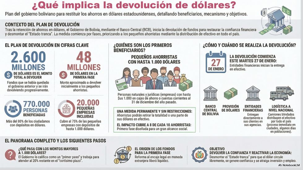El gobierno del presidente Rodrigo Paz oficializó este lunes el inicio de la devolución de dólares estadounidenses en efectivo a pequeños ahorristas del sistema financiero nacional. La medida, que entra en vigor este martes 27 de enero de 2026, habilita el retiro de fondos a clientes con saldos iguales o menores a $us 1.000 y marca el primer paso en el plan de estabilización monetaria tras las restricciones de divisas vigentes desde 2023.