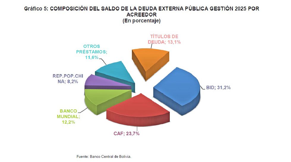La estructura de la deuda muestra una alta concentración en organismos multilaterales. El Banco Interamericano de Desarrollo (BID) se mantiene como el principal acreedor con el 31,2% del saldo total, seguido por la Corporación Andina de Fomento (CAF) con el 23,7% y el Banco Mundial con el 12,2%. Por su parte, la República Popular de China figura como el mayor acreedor bilateral con una participación del 8,2%.