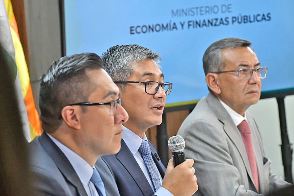 MACROECONOMÍA. Espinoza (d) dijo que incluso están superando las perspectivas más optimistas. Foto: APG El Gobierno reportó este lunes un superávit fiscal de más de 2.300 millones de bolivianos en enero, que se atribuye a medidas como el fin de la subvención a los combustibles, la “racionalización” de la planilla estatal y la reducción del gasto público “dispendioso”.