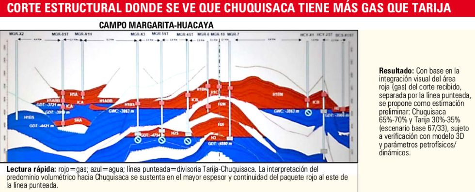 “Esta proyección está en función a una lámina y a un corte estructural donde se encuentran todos los pozos del campo Margarita-Huacaya y donde Chuquisaca tiene obviamente más gas remanente que Tarija”, afirmó el experto.