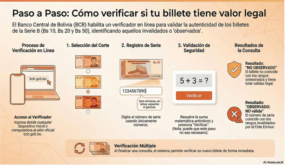 El Banco Central de Bolivia (BCB) puso a disposición del público una herramienta en línea para verificar la validez de los billetes de Bs 10, Bs 20 y Bs 50 de la Serie B. La medida busca dar certidumbre a la población tras la anulación de 17,1 millones de piezas que se encontraban en un avión siniestrado en la ciudad de El Alto. A partir de este lunes 2 de marzo, el resto de los billetes de esta serie retoman su valor legal y pueden circular con normalidad.