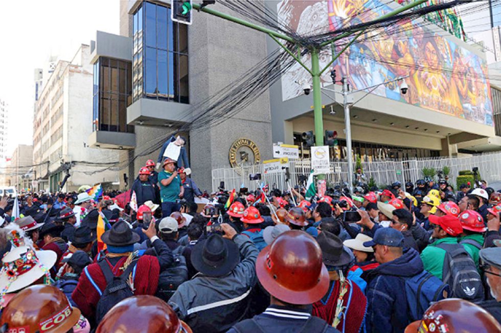 El secretario ejecutivo de la COB, el minero Mario Argollo, lideró la protesta integrada por mineros, maestros, campesinos e indígenas, que con la manifestación colapsaron el centro de La Paz por varias horas.