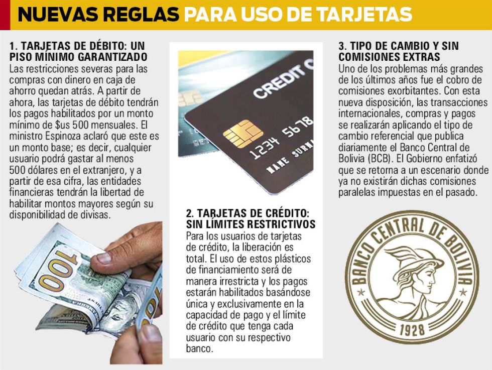 El Gobierno amplió a 500 dólares mensuales el monto mínimo para realizar pagos con tarjeta de débito en el exterior del país, en tanto que las tarjetas de crédito se podrán utilizar de manera irrestricta en función a la capacidad de pago de cada usuario. Estas transacciones estarán indexadas al tipo de cambio referencial del Banco Central de Bolivia (BCB) y ya no a la cotización oficial.