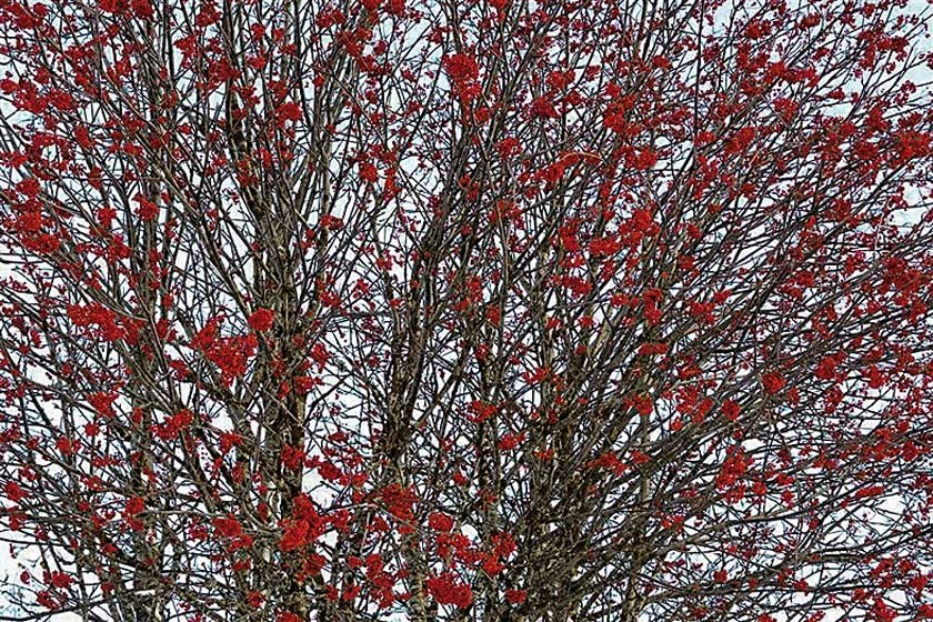 En el puerto de Monteviejo, provincia de León, hay una zona poblada de servales y este año estaban bastante cargados de frutos. Su rojo intenso entre las ramas desnudas de hojas y sobre el cielo nublado dan a la fotografía un aspecto de cuadro puntillista.