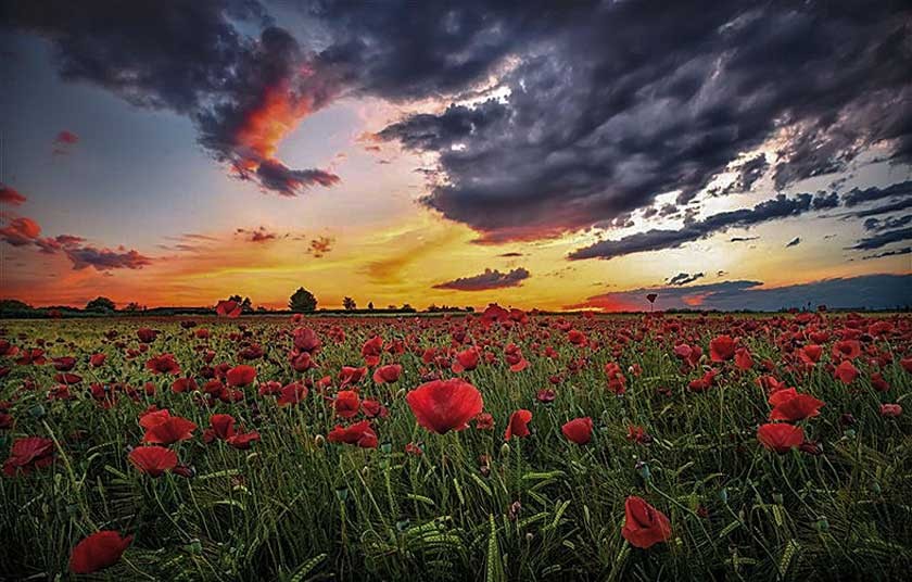 Eran las últimas luces del día y acababa de llover cuando el fotógrafo se dispuso a realizar una toma de las amapolas recién mojadas. Inicialmente quería hacer un primer plano de alguna de ellas, pero mientras buscaba el encuadre se vio sorprendido con los tonos que aparecieron en el cielo. En ese instante cambió el lente a gran angular, puso el portafiltros y un filtro degradado de tres pasos para el cielo, se apoyó en el trípode y utilizó la hiperfocal del objetivo para tomar toda la foto bien enfocada.