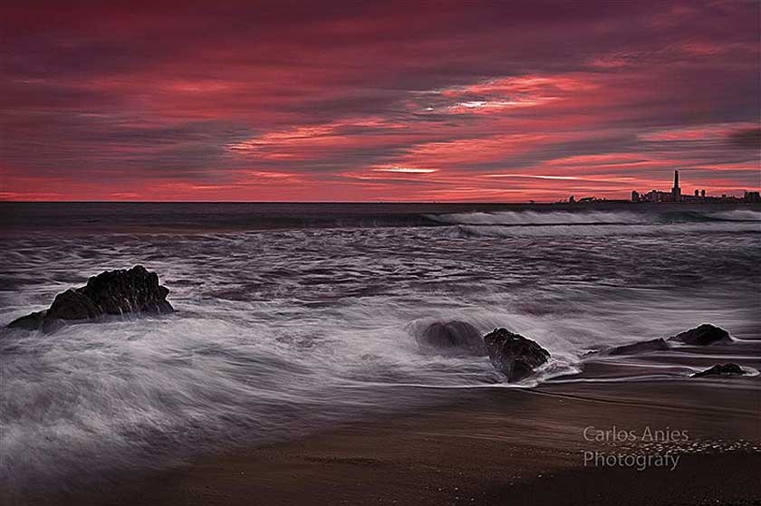 La Playa de Montgat al amanecer. Al fondo, Barcelona.