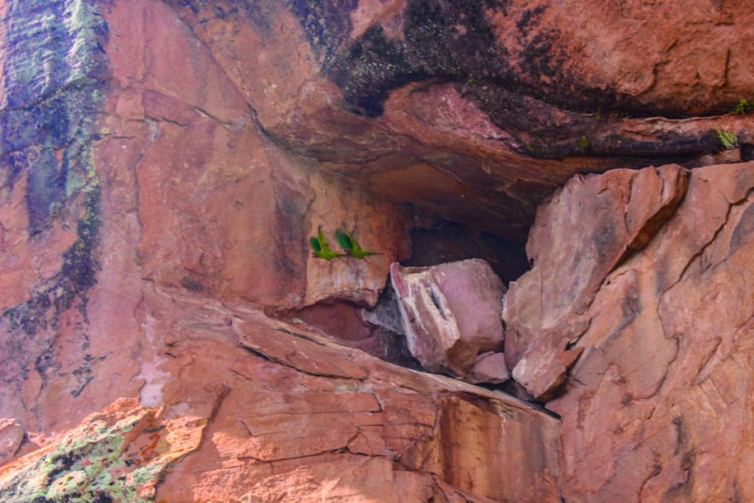En el camino vemos el aleteo de un alkamari y la escapada de una vizcacha; escuchamos el vuelo alto de la paraba frente roja (también en peligro de extinción) y uno más cercano y bullicioso de loros que planean emparejados de un nido a una palmera.