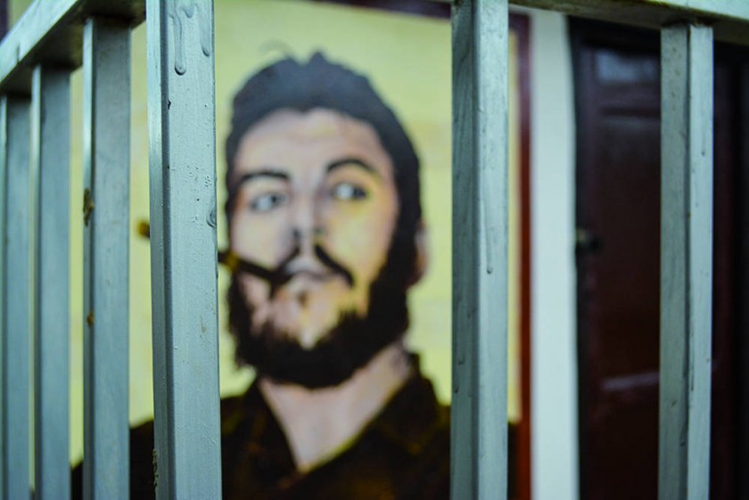 Lado a lado, unas pocas casas yacen con murales y grafitis en sus fachadas; pero también, a modo de escaparate, camisetas con la icónica imagen del guerrillero, una pequeña muestra de esa gigantesca y global industria de suvenires en torno al ícono de la Revolución Cubana.