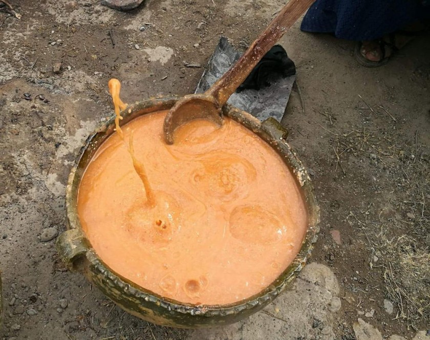 “La kalapurka se prepara con maíz que se muele en ‘khonas’ (molino de piedra manual), luego esa harina de maíz se mezcla con agua y ají colorado y se hace cocer con piedras calentadas al rojo vivo. Se adorna con algunas carnes y perejil. También tenemos la pizzara de quinua, jarwi lawa, ají de pelado, de habas y de otros alimentos que allí se producen”, explica el comunario.