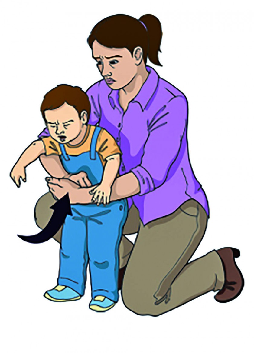 Las maniobras de expulsión que deben realizarse en lactantes son golpes interescapulares y golpes torácicos, y la maniobra de Heimlich: colocar las manos sobre el epigastrio, una mano con el puño cerrado y el pulgar hacia dentro y la otra rodeando el puño, y a continuación se presiona cinco veces sobre el epigastrio, con movimientos rápidos dirigidos hacia atrás y hacia arriba.