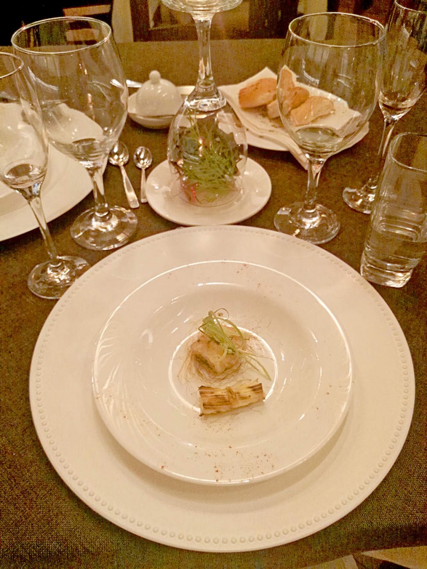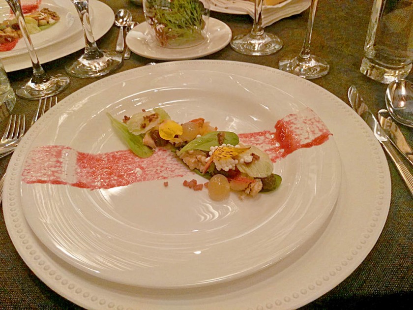 Primer tiempo: Jardín de pavo. Reducción de ciruelas, caviar de crema, crouton de pavo inyectado, mix de verdes, nueces, pasas de uva, arándanos deshidratados, manzana verde, apio y esferificaciones de puré de pera. Maridaje (es el proceso de casar metafóricamente a un alimento con un vino con la intención de realzar el placer de comerlos).