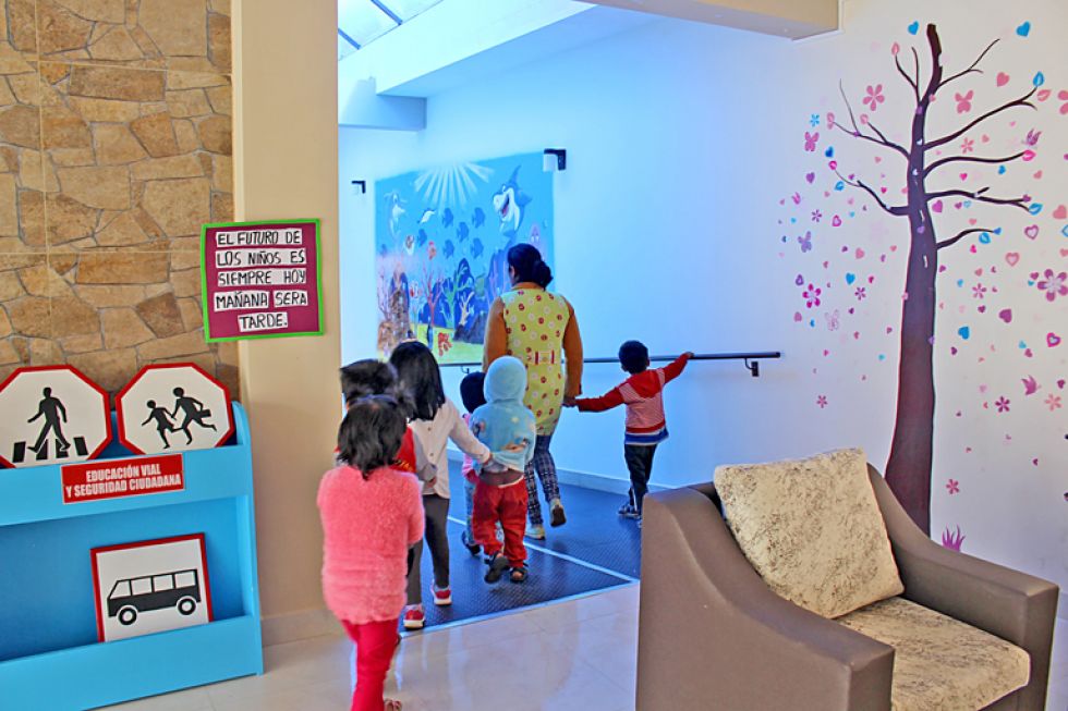 En el marco de un plan pedagógico semanal, en un espacio se trabaja la parte emocional y afectiva. En otro, el movimiento psicomotriz grueso: escalan en una pared que simula los cerros Sica Sica y Churuquella, hay una barra de equilibrio, pelotas, ula ulas y el no menos popular pata-pata. En otro ambiente, la motricidad: cantan, incluso, en quechua.