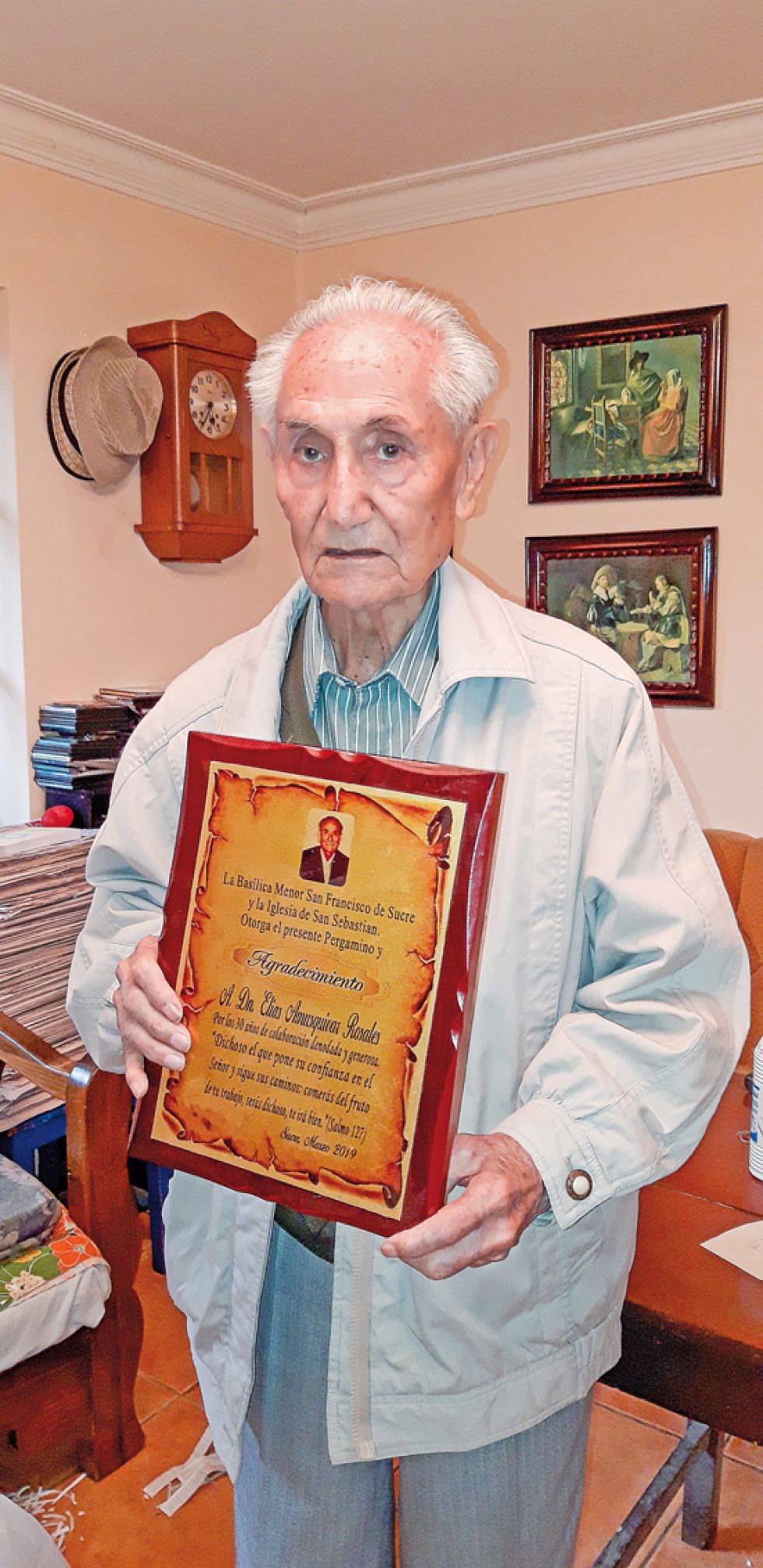 Elías fue el custodio y administrador del templo de San Sebastián por 30 años, una labor que cumplió hasta 2019. En mérito a su servicio, la Iglesia católica, a través de San Sebastián y la Basílica de San Francisco —para la que también hizo obras—, le otorgó varios reconocimientos. El más reciente, un pergamino y agradecimiento “por los 30 años de colaboración denodada y generosa”.