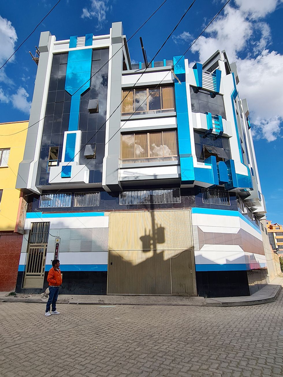 No tiene una obra favorita, o al menos eso dice cuando estamos en la casa de cuatro plantas de Dionisio Flores, más moderna y minimalista que otros trabajos de su estilo, me dice él. Colores vibrantes, flores, otros elementos naturales y toques andinos, “plasmando lo que es Tiahuanaco”, se ven en el inmueble casi acabado, donde los propietarios y sus hijos observan la entrevista, tan tímidos como orgullosos.