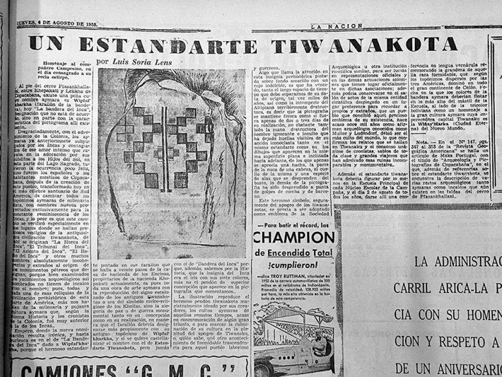El hallazgo está descrito en el artículo titulado “Un estandarte tiwanakota” que se publicó el 6 de agosto de 1953 en el periódico La Nación y está actualmente resguardado en la hemeroteca del Archivo y Biblioteca del Ministerio de Relaciones Exteriores. Allí fue encontrado por el investigador José Eduardo Pradel Barrientos.