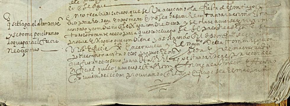 El estandarte fue muy importante, tanto que no solo portarlo en la fiesta de Santiago, sino sacarlo y devolverlo al archivo del cabildo, era un privilegio para el que anualmente se designaba diputados, pero su origen está claramente documentado en el acuerdo del 24 de mayo de 1591 en el que los capitulares ordenaron “que se haga con brevedad la confección del estandarte para la fiesta de Santiago”.