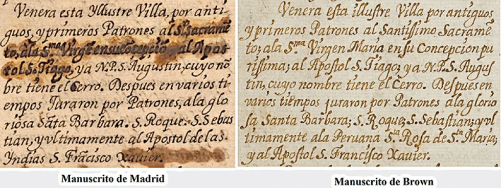 Se trata de un valioso resumen de los patronos que tuvo Potosí en tiempos coloniales, en apenas un párrafo, pero, después, en tiempo imposible de determinar, cuando Arsánz hizo la primera copia de su manuscrito, agregó otra figura, Santa Rosa de Lima, a la que identificó como “la peruana Santa Rosa de Santa María”. El párrafo original está en el hoy denominado “Manuscrito de Madrid” mientras que el segundo corresponde al llamado “Manuscrito de Brown”.