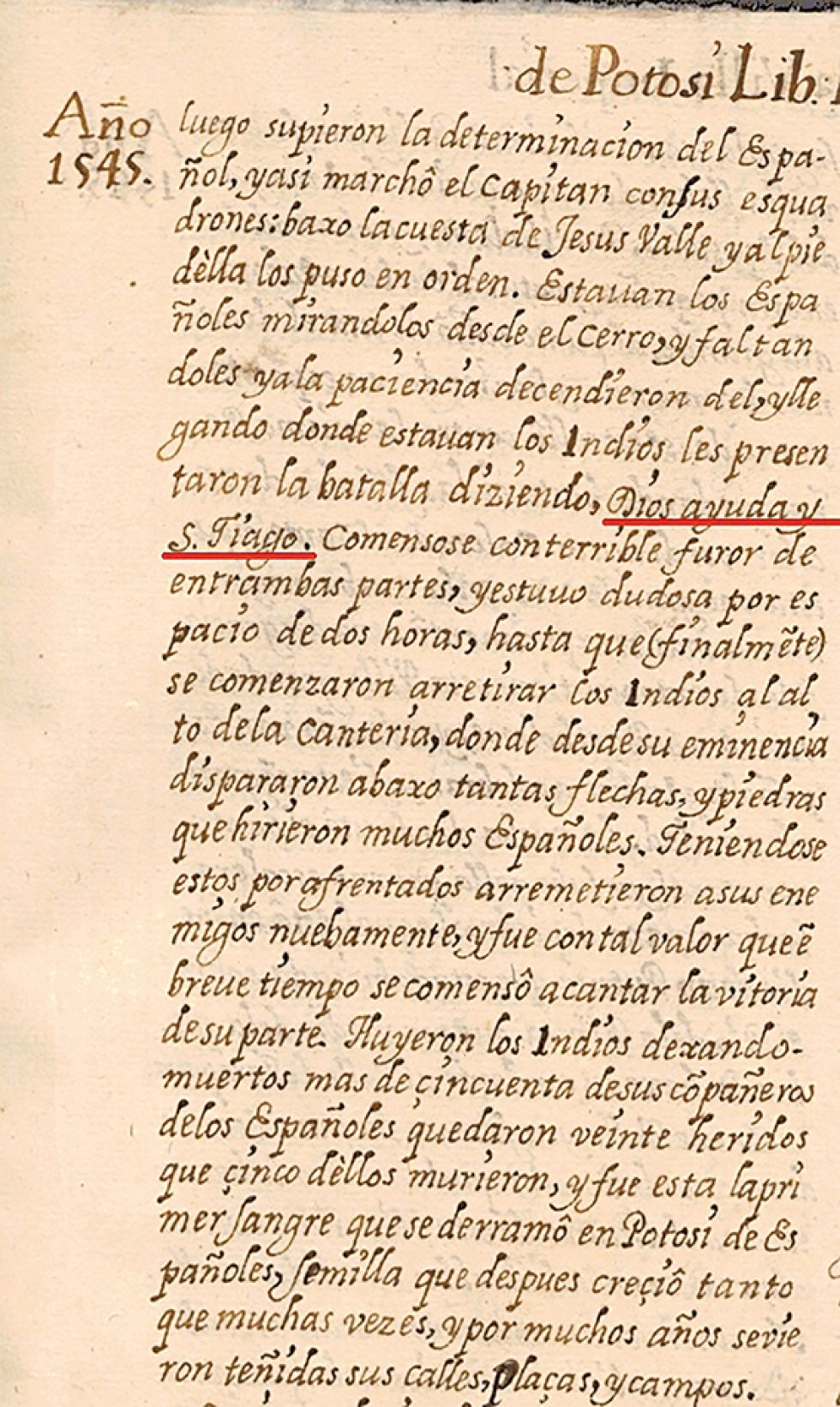 “Estauan los españoles mirándolos desde el Cerro, y faltándoles ya la paciencia decendieron del, y llegando donde estauan los indios les presentaron la batalla diziendo, Dios ayuda y S. Tiago. Comensose con terrible furor de entrambas partes y estuuo dudosa por espacio de dos horas, hasta que (finalmente) se comenzaron arretirar los indios al alto de la Cantería, donde desde su eminencia dispararon abajo tantas flechas, y piedras que hirieron muchos españoles. Teniéndose éstos por afrentados arremetieron a sus enemigos nuebamente y fue con tal valor en breve tiempo se comensó a cantar la vitoria que de su parte. Huyeron los indios dexando muertos más de cincuenta de sus compañeros; de los españoles quedaron veinte heridos que cinco dellos murieron, y fue ésta la primera sangre que se derramó en Potosí de españoles, semilla que después creció tanto que muchas veces y por muchos años se vieron teñidas sus calles, plaças y campos”.