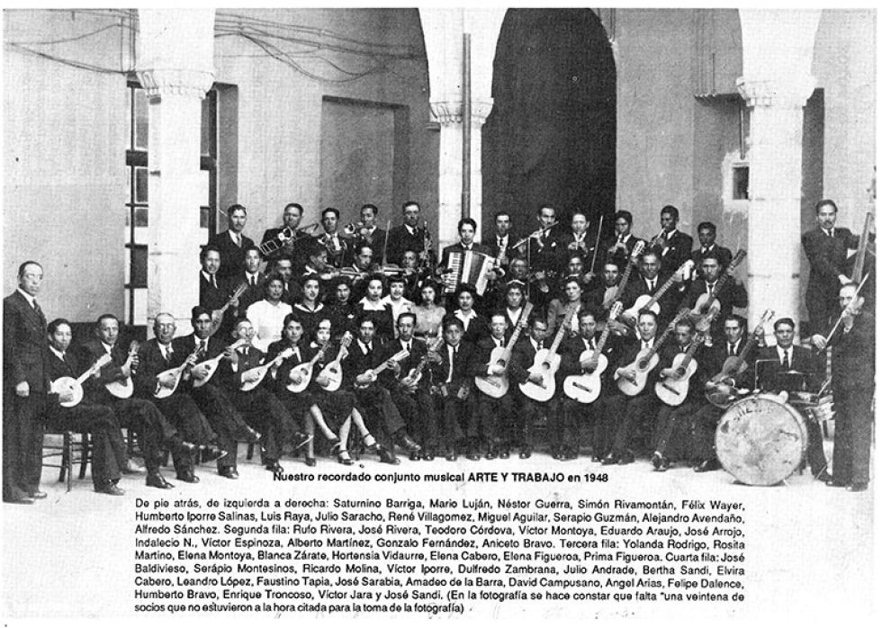 CONJUNTO MUSICAL “ARTE Y TRABAJO”.- El año 1948 se organizó otro conjunto musical denominado “Arte y Trabajo” con similar cantidad de integrantes; con ocho mandolinas, cinco charangos, nueve guitarras, cinco violines, contrabajos, media docena de flautas dulces, cornetas, trombones, bajos, acordeón, batería y excelentes voces melodiosas de doce damas que lograron cultivar la música para deleite de los ciudadanos de la Villa Imperial.