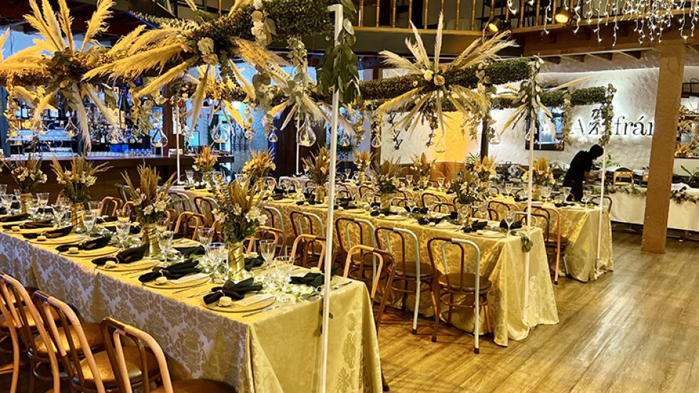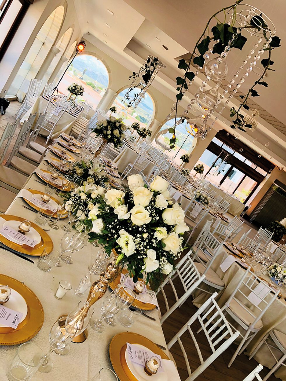 Las flores dependen de la temporada, pero generalmente se usa mucho follaje, el eucalipto moneda está en tendencia, los jardines colgantes que le dan mayor relevancia a los cielos falsos, backdroop de jazmines, centros de mesas descontraídos, los lisianthus y las rosas jamás pasan de moda.